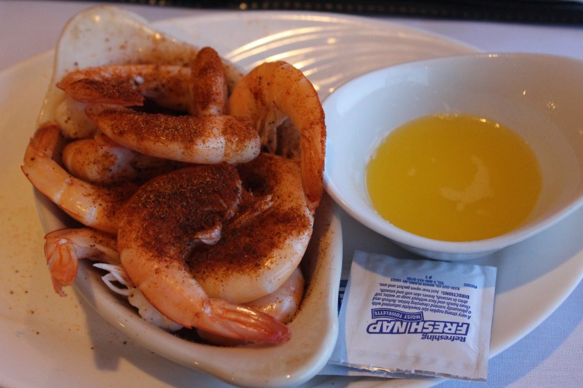 We started off with the ½ lb of of Steamed Shrimp seasoned with Old Bay, and a side of melted real butter. If you are allergic to gluten and soy don’t be shy in asking for real butter. Most of the time if you request it restaurants have it as an option so do not be shy! Now, back to the food; the appetizer was steamed perfectly and the shrimp were perfect size. My wife and I ended up splitting the last one.