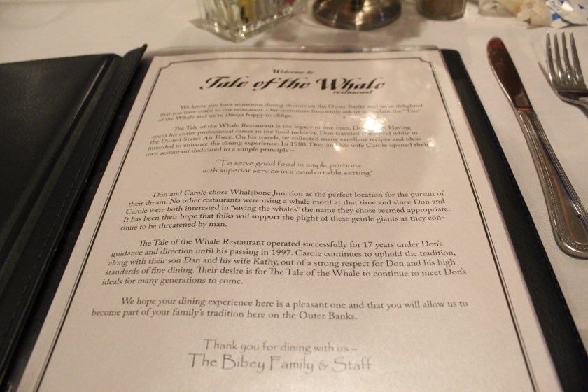 For our first night of being in the Outer Banks we knew we wanted to go somewhere that was going to fill our rumbling stomachs and start our anniversary celebration off right! We searched google for some safe gluten-free friendly restaurants and found Tale of a Whale. Having an allergy to gluten and soy my wife has to research and email, and call places to make sure the owners can accommodate her. After speaking with the owner and him assuring us he would make sure our meal was safe we knew we had to try this place out. Prior to visiting most restaurants we always reach out and talk to the managers to insure they can accommodate the allergies and to understand the cooking practices in the kitchen to avoid cross contamination. I was very fortunate to get to talk to the owner Dan Bibey. Mr. Bibey was very nice and knowledgeable about the capabilities of his kitchen. I left the conversation feeling reassured that my wife and I would have a pleasant dining experience for our 12th anniversary.