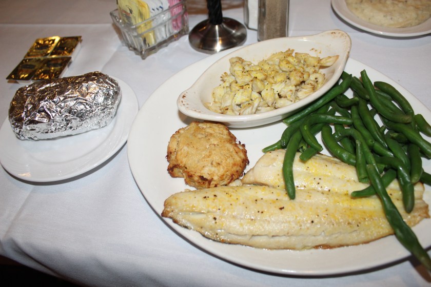 Flounder with fresh crab meat, a crabcake, green beans and a baked potato all Gluten Free and Soy Free
